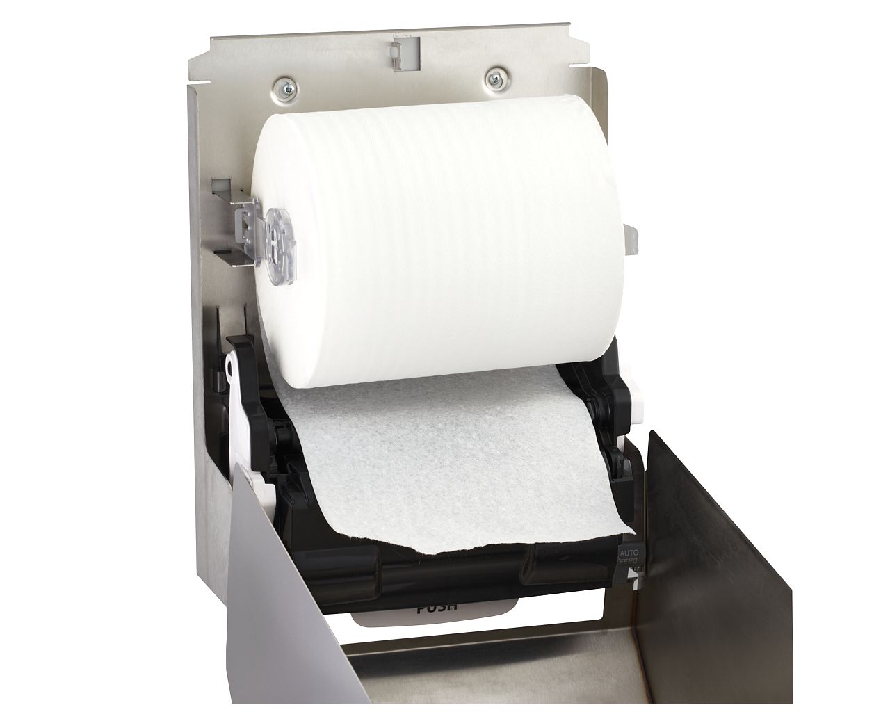 Automatyczny, bezdotykowy podajnik ręczników papierowych w roli zapewnia higieniczne użytkowanie, dotykany jest tylko pobierany ręcznik. Podajnik ręczników zasilany jest 4 bateriami alkalicznymi R20, baterie dołączone lub zasilaczem sieciowym. Zasilacz chowany wewnątrz urządzenia w miejscu kasety na baterie, zasilacz można podłączyć bezpośrednio do puszki elektrycznej za urządzeniem (zasilacz kupowany osobno). W urządzeniu łatwo zakłada się nową rolkę papieru z wykorzystaniem wewnętrznego przycisku AUTO FEED do automatycznego nawinięcia papieru na rolki. Diodowy wskaźnik stanu urządzenia, umiejscowiony w dolnej części podajnika, migając na niebiesko sygnalizuje gotowość do pracy, migając na czerwono co 5 sekund sygnalizuje słabe baterie,świecąc stale na czerwono sygnalizuje wyczerpane baterie, migając pulsacyjnie na czerwono sygnalizuje zakleszczenie papieru w urządzeniu. W podajniku jest łatwy dostęp do mechanizmu tnącego umożliwiający bezproblemowe czyszczenie oraz konserwację urządzenia. Podajnik ręczników zabezpieczony jest trwałym stalowym zamkiem bębenkowym. Zamek zlicowany z powierzchnią urządzenia. Łączenia boków podajnika ręczników są spawane i szlifowane. Urządzenie posiada niewidoczne zawiasy, obudowa i tylna ścianka wykonana ze stali nierdzewnej. Zamykany na kluczyk.