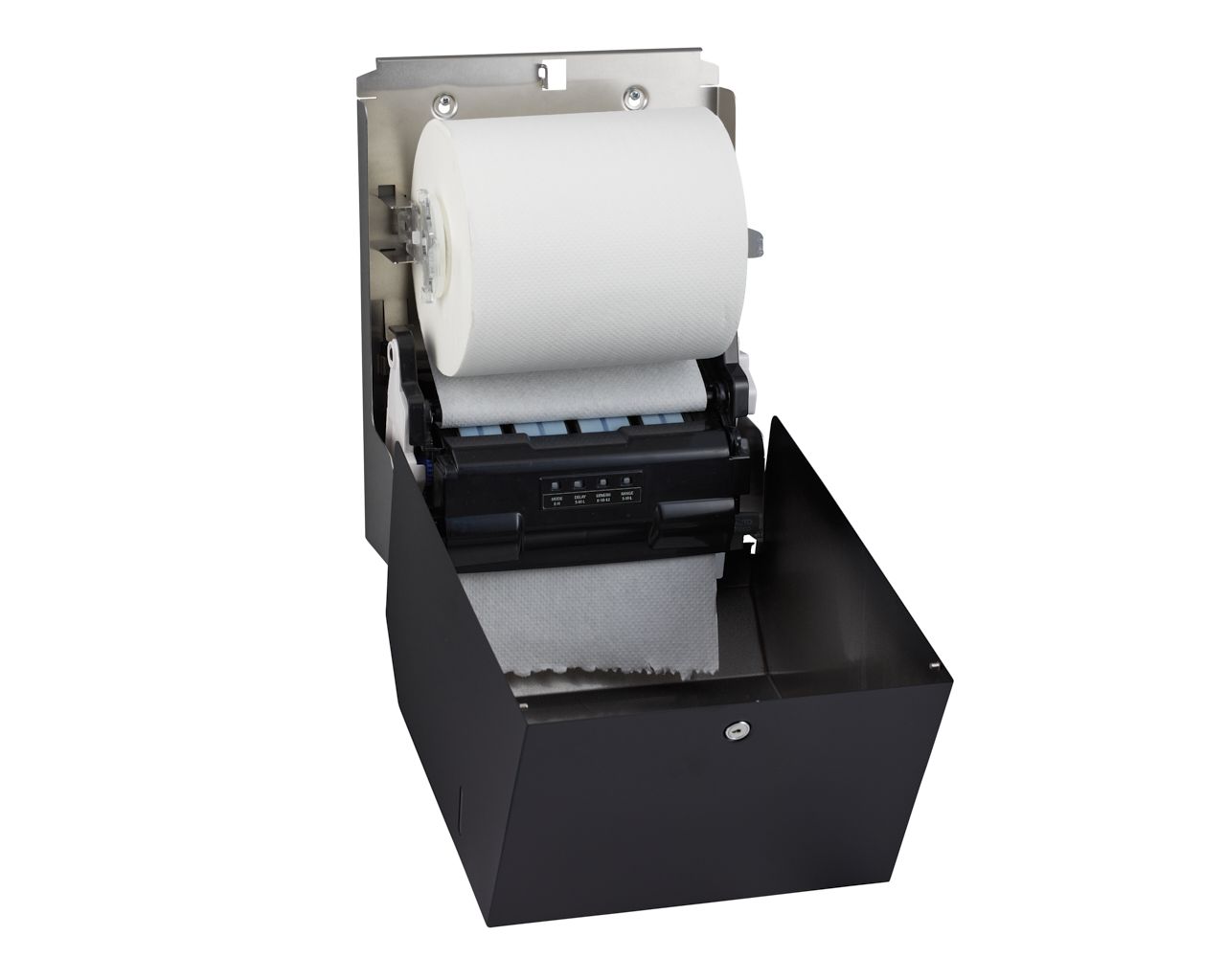 Automatyczny, bezdotykowy podajnik ręczników papierowych w roli zapewnia higieniczne użytkowanie, dotykany jest tylko pobierany ręcznik.