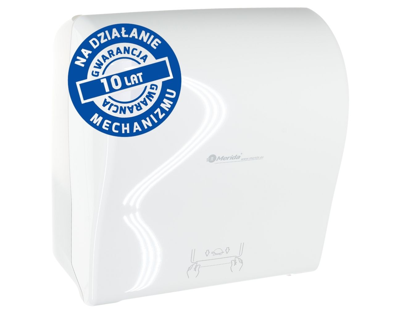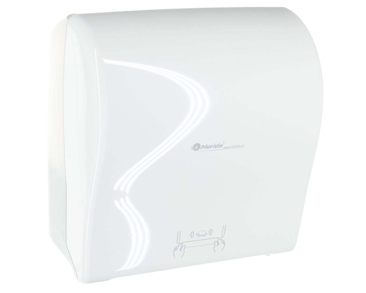 Mechaniczny podajnik ręczników papierowych w rolach MERIDA SOLID CUT AUTOMATIC MAXItworzywo ABS, front pełen biały – połysktył transparentny jasny – połysk