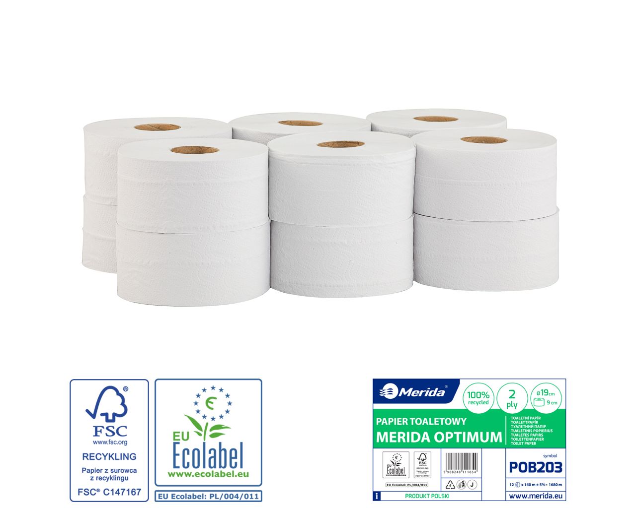 Papier toaletowy MERIDA OPTIMUMbiały, średnica 19 cm, długość 140 m, dwuwarstwowy, zgrzewka 12 szt.ECOLABEL