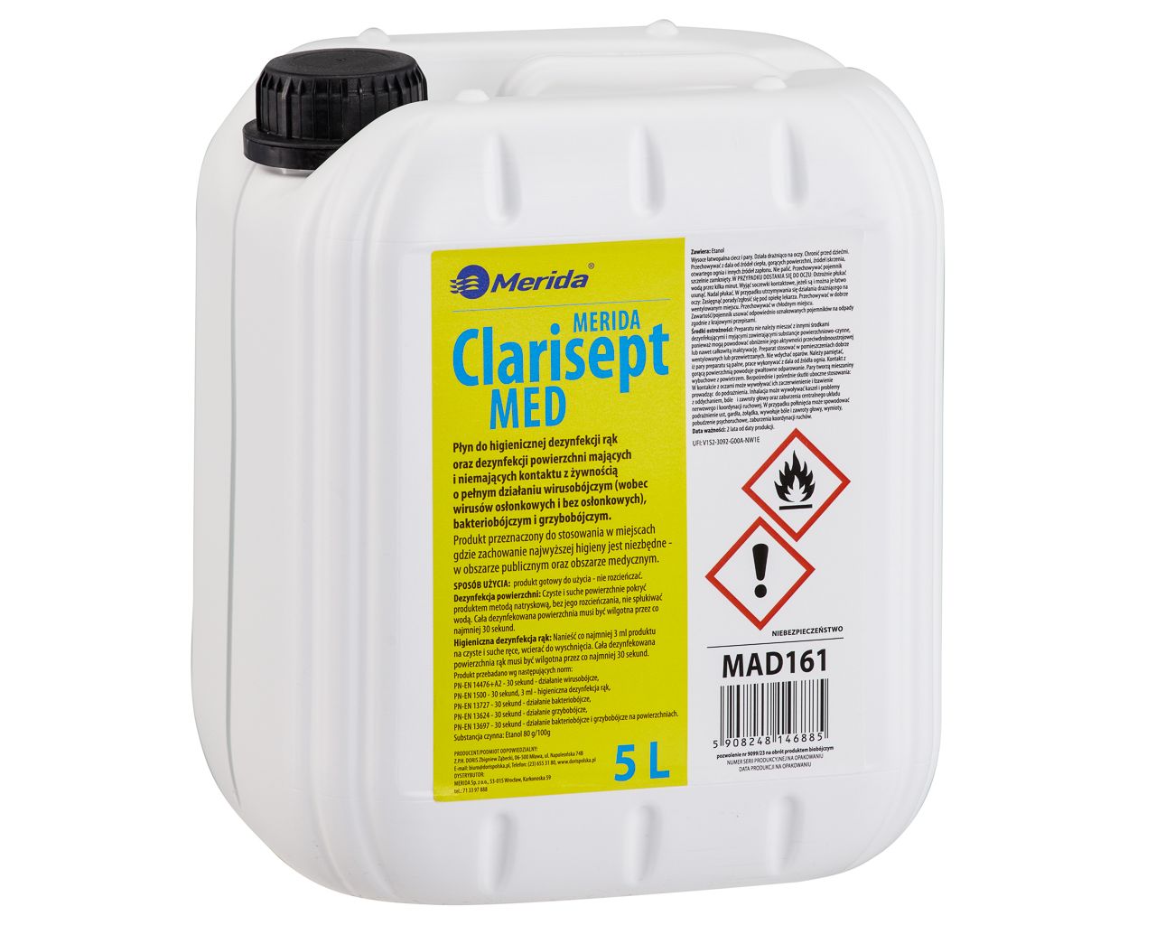 Płyn dezynfekcyjny MERIDA CLARISEPT MED to gotowy do użycia alkoholowy preparat do higienicznej dezynfekcji rąk i dezynfekcji powierzchni mających i niemających kontakt z żywnością. Skuteczny w walce bakteriami, wirusami (w tym wobec koronawirusa) i grzybami. Przebadany dermatologicznie.