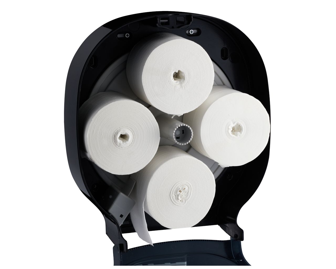 – dzięki specjalnemu mechanizmowi, kolejna rolka papieru dostępna jest dopiero po zużyciu tej obecnie używanej, co eliminuje problem pozostających końcówek rolki