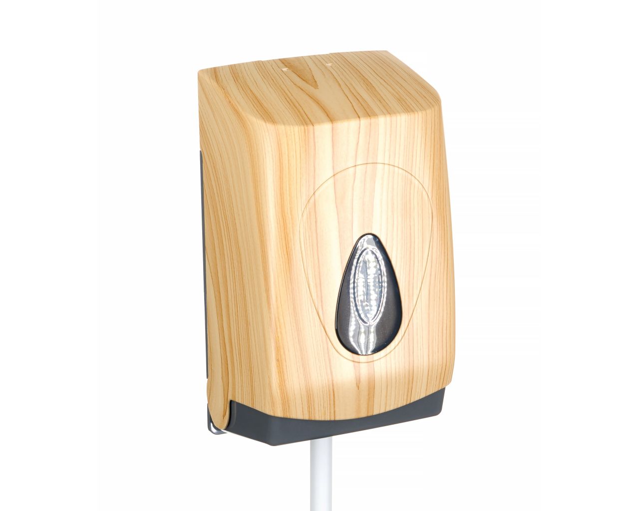 Pojemnik wykonany z wysokiej jakości tworzywa ABS o pojemność do 400 szt. listków papieru. Dostosowany do użytkowania z papierem toaletowym w listkach. Zaopatrzony w ozdobne, ciemnoszare okienko umożliwiające kontrolę ilości papieru w pojemniku. Odporny na działanie UV. Pojemnik zamykany na kluczyk.