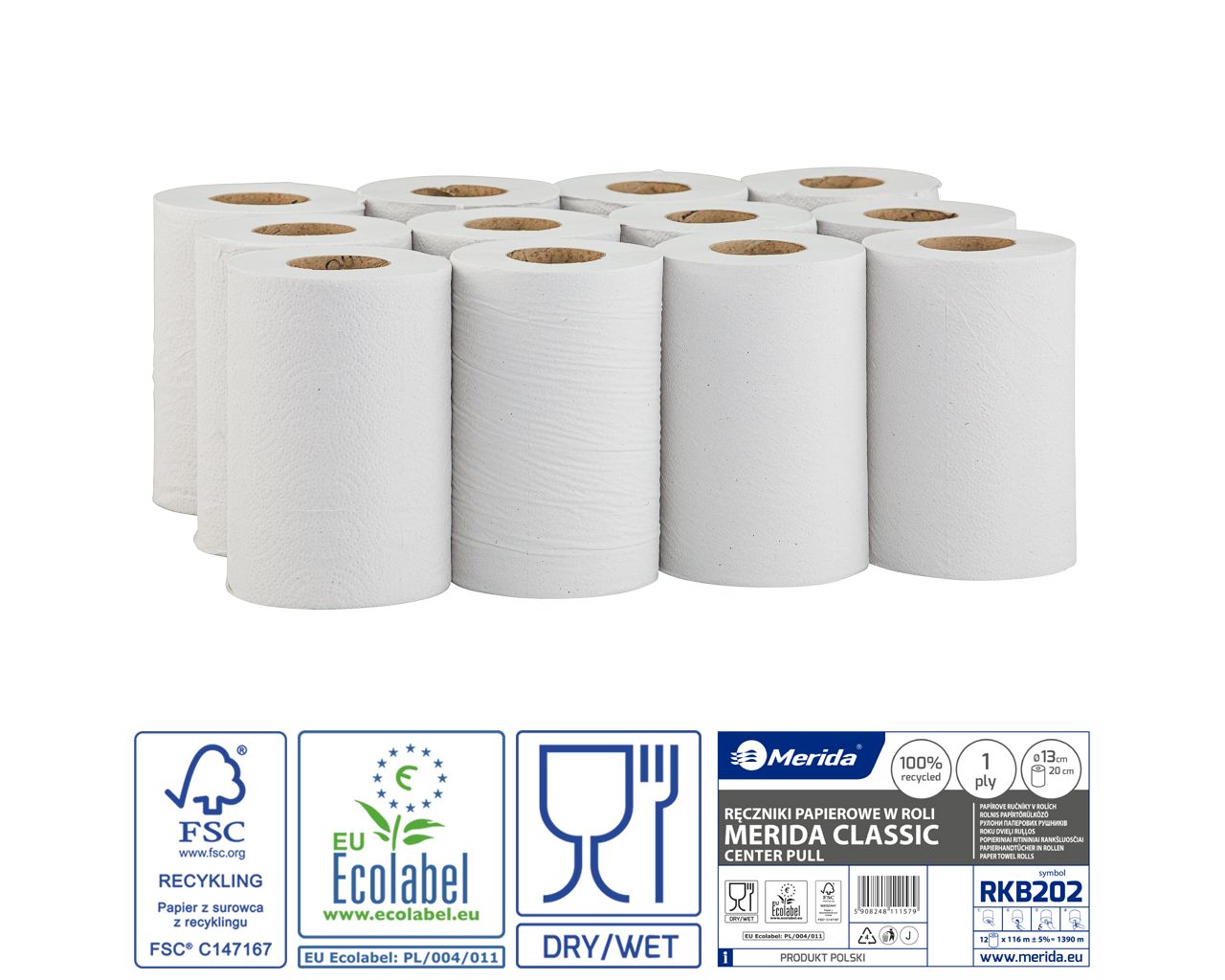 Ręczniki papierowe w roliMERIDA CLASSIC CENTER PULL MINI ECOLABEL, jednowarstwowe, białe, średnica 13 cm, długość 116 mzgrzewka 12 rolek