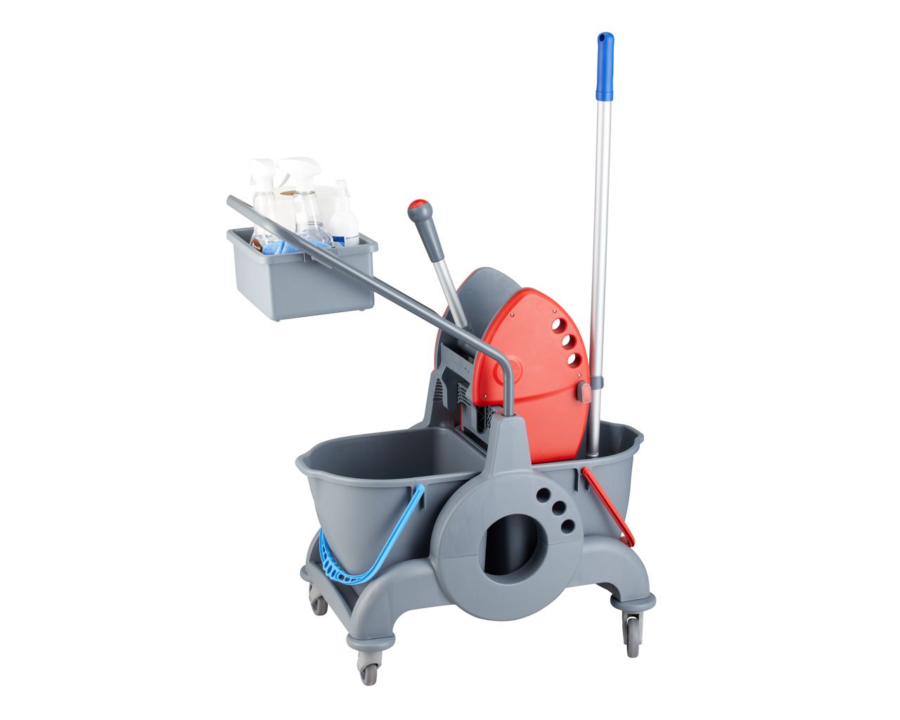 Wózek serwisowy do sprzątaniadwuwiadrowy, 2× wiadro 15 l, kuweta 8 lczerwona prasa